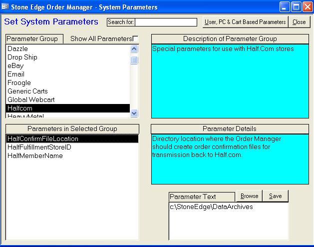 HalfConfirmFileLocation - Directory location where the Order Manager should create order confirmation files for transmission back to Half.com. Default is c:\StoneEdge\DataArchives.