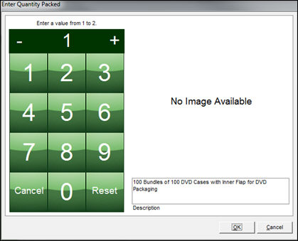 When using a barcode scanner, set system parameter PackingUseKeypadForQuantity to TRUE to display a keypad to enter the number of units packed when the scanned item has a quantity greater than one. The keypad cannot be used if the item requires the user to enter a serial number when it is packed. Refer to the Use Serial #'s check box of an item's inventory record.