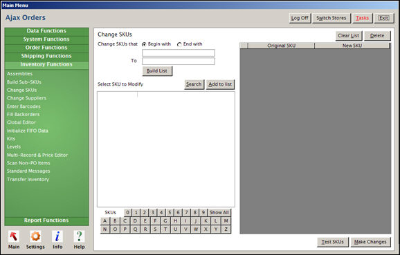 The Change SKUs screen is accessed from Main Menu>Settings>Inventory Functions.