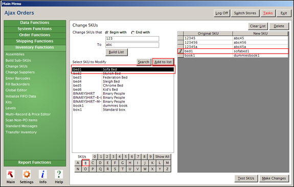 The Select SKU to Modify pane now contains a list of all SKUs that start with the letter "B".