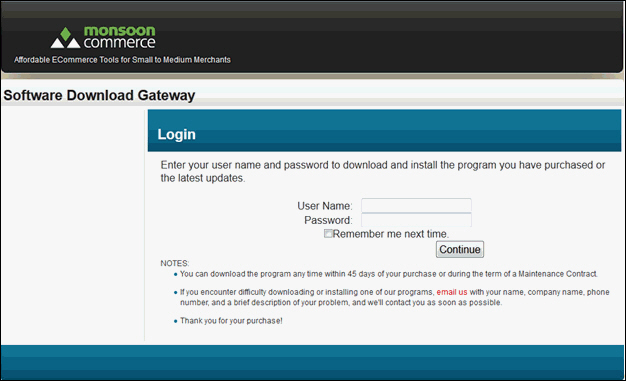 Go to the Monsoon Commerce download gateway and log in with the User ID and password supplied in the order confirmation email when you purchased the Subscription Manager.