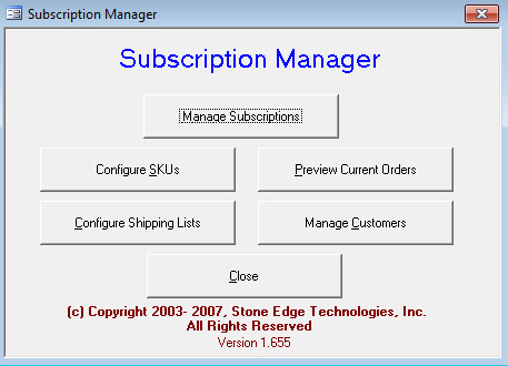 Subscription Manager is a licensed add-on to SEOM that allows a merchant to generate manual orders on a recurring basis, for a single inventory item or a related series of items, such as a Wine of the Month club. Contact sales@stoneedge.com to purchase a license for Subscription Manager.