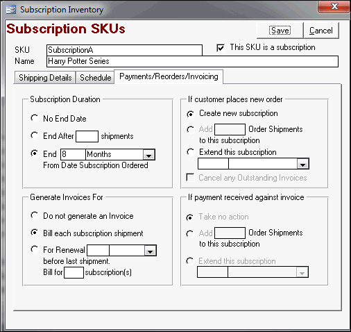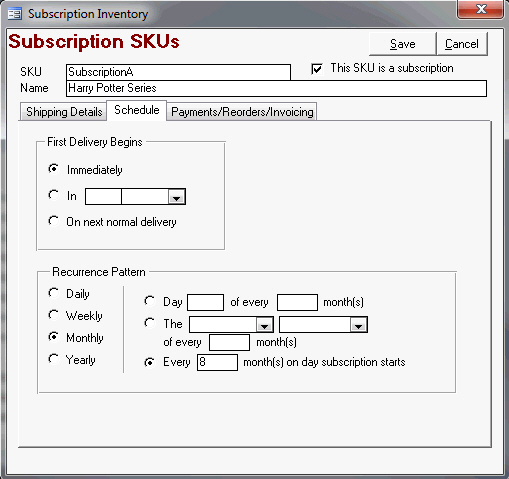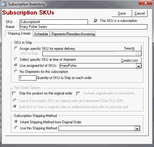 Open the Subscription Manager user interface and flag the SubscriptionSKU as a "subscription" and tell the program the specific inventory item or items to ship when fulfilling the subscription.
