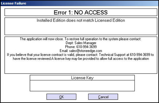 If the [Cancel] button on the Invalid Login! screen is clicked, the License Failure Screen opens.
