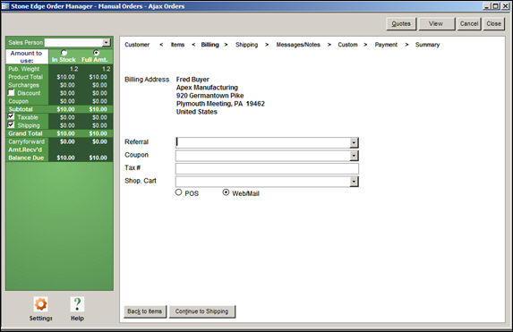 Click the links across the top of the screen to step through each section, or phase, of placing a manual order. Using these links, it is possible to jump between different phases, out of their normal sequence.