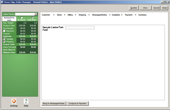 Click the links across the top of the screen to step through each section, or phase, of placing a manual order. Using these links, it is possible to jump between different phases, out of their normal sequence.