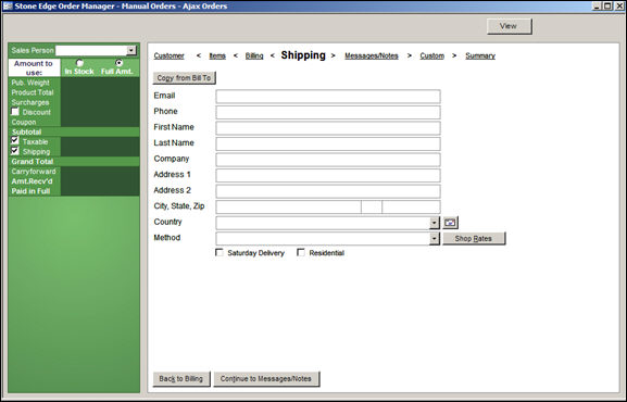 Click the links across the top of the screen to step through each section, or phase, of placing a manual order. Using these links, it is possible to jump between different phases, out of their normal sequence.