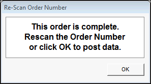The Re-scan Order Number screen pops up to confirm that an order is completely packed.