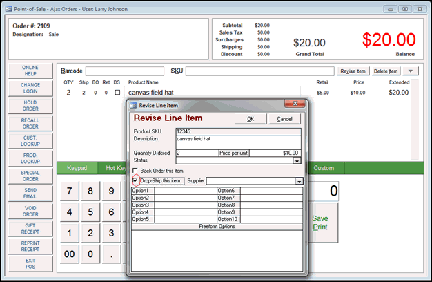 The DropShip box on the line item of the POS screen is now selected. Note: You cannot select or clear the DropShip box on the POS screen; you must use the Revise Item screen to change the item's status.
