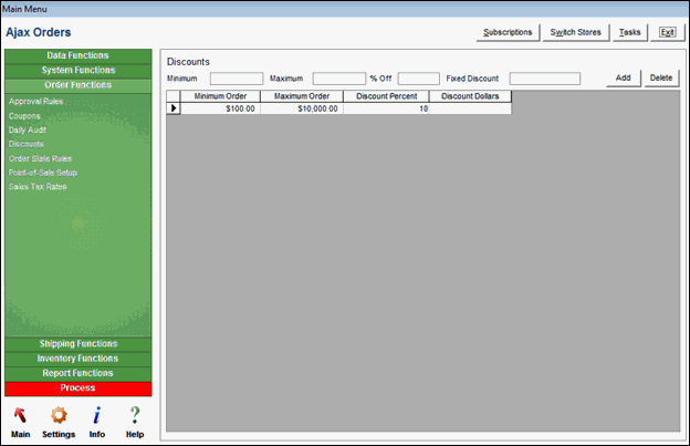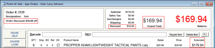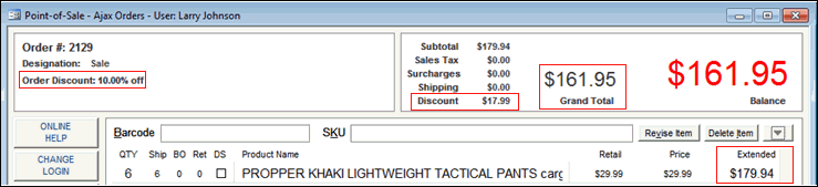 The program calculates the reduction in cost based on the pre-defined discount level in which the order total falls. The amount of the discount is displayed in the upper right-hand side of the screen.