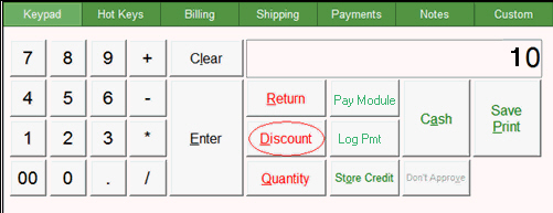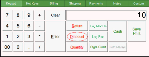 On the Keypad tab, enter the numeric amount of the discount and select Discount. To change the numeric value, click Clear.