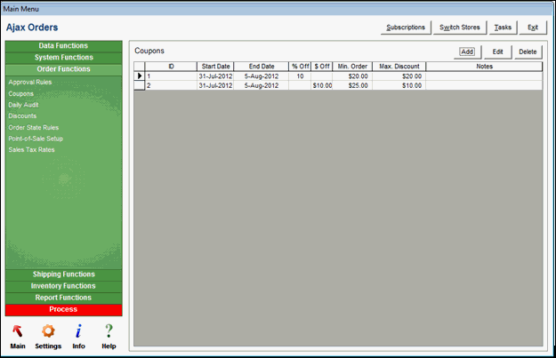 Create coupons through Main Menu > Settings > Order Functions > Coupons.