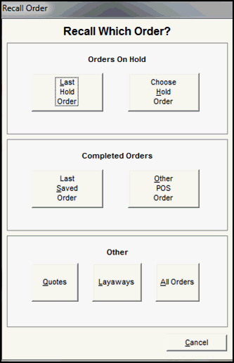 Use the Recall an Order function view orders placed on hold temporarily using the Hold Order button and special orders such as layaways, orders placed on hold indefinitely, or quotes.