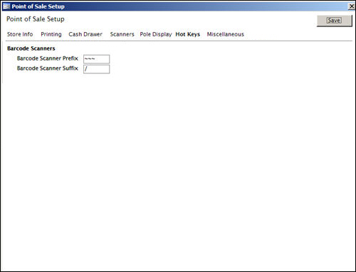 The data passed from barcode scanners is interpreted as keyboard input by the POS system. For the POS to distinguish barcodes, special "prefixes" and "suffixes" must be added to the data. Most barcode scanners can be programmed with a prefix and suffix; consult the documentation provided with the hardware for details.