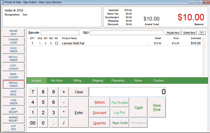 The Special Order Hot Key provides the ability to designate an order as On Hold for an indefinite amount of time. The Special Order On Hold designation is different from the Hold Order (F3) function, which puts an order on Hold only until the end of the day. See POS Putting Orders on Temporary Hold for more information about the Hold Order button.