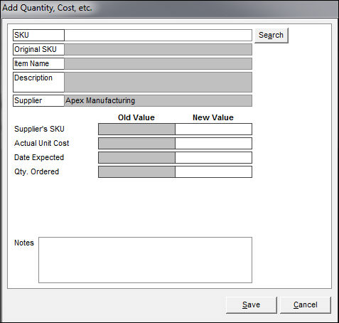 - cannot be edited and show the original values of the Supplier's SKU, Expected Cost, Date Expected, and Quantity Expected fields