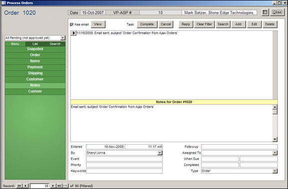 The Notes Tab of the Process Orders screen displays a list of all the Notes or Tasks associated with the current order in the right-hand pane. Select a note from the list and view the details of that note in the lower half of the screen.