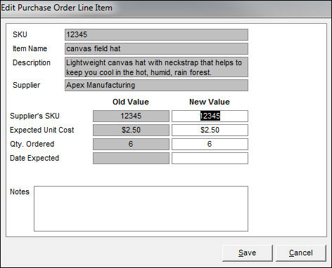 - cannot be edited and show the original values of the Supplier's SKU, Expected Unit Cost, Date Expected, and Qty. Ordered fields
