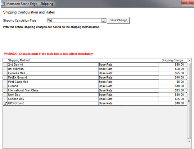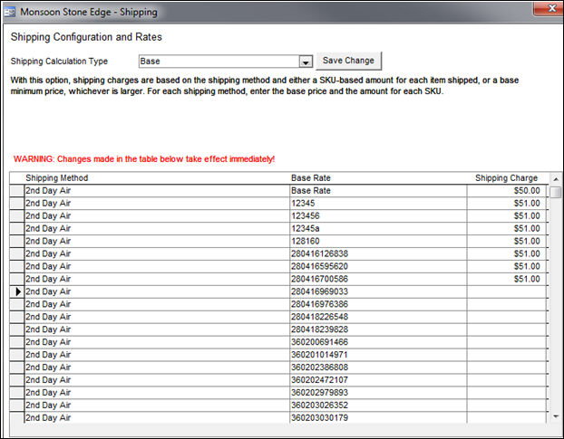 Base: Enter a minimum Base Rate amount for each Shipping Method in the Shipping Charge field. Optionally, enter a minimum Shipping Charge amount for each product and Shipping Method. The program uses the greater of the two amounts if both are specified. If no minimum is specified for the item, the base rate for the shipping method is used. view image