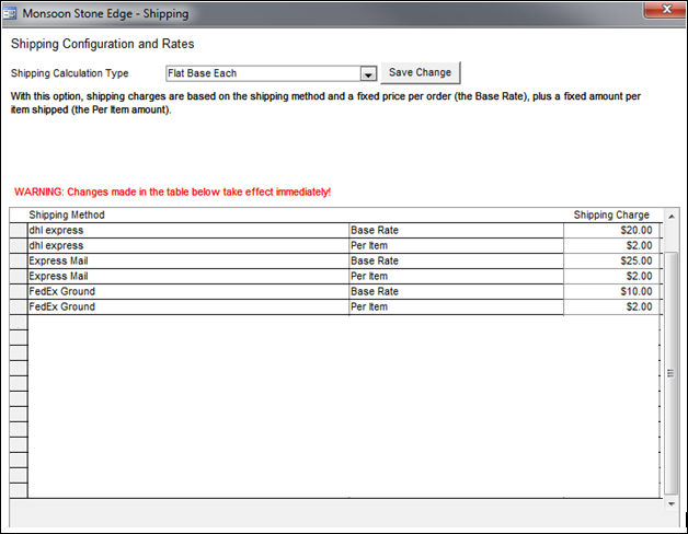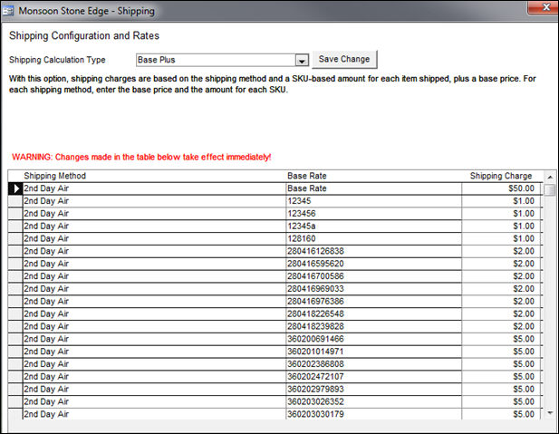 Base Plus: Enter a minimum Base Rate amount for each Shipping Method in the Shipping Charge field. For each product, enter a Shipping Charge amount to be added to the Base Rate of the Shipping Method. view image
