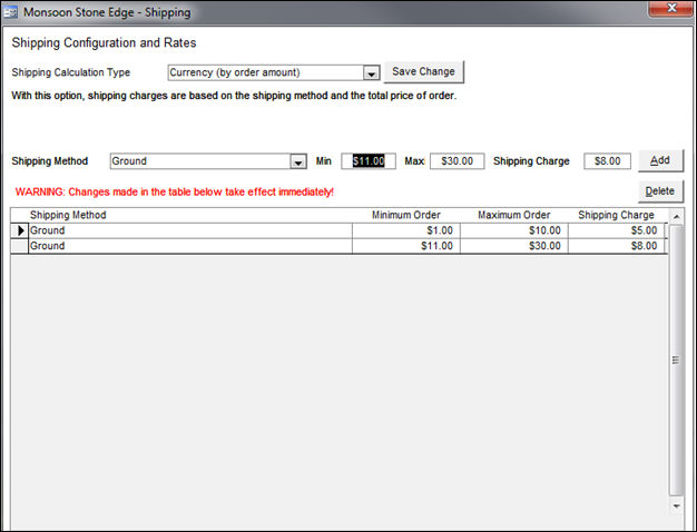 Currency: For each Shipping Method, enter amounts in the Min, Max (order amount), and Shipping Charge fields beside the Shipping Method drop-down list. Click Add to save the settings to the table at the bottom of the screen. view image