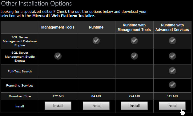 To obtain this product, you must first install the Microsoft Web Platform (WebPI), which allows you to select other application files that can be downloaded and installed at the same time. Click the first link below to begin the combined installation process and follow the directions in the section entitled, Installing/Configuring SQL Server. The other links are provided as a courtesy to obtain background information on each of the pre-requisite components but should not have to be used to download and install them.