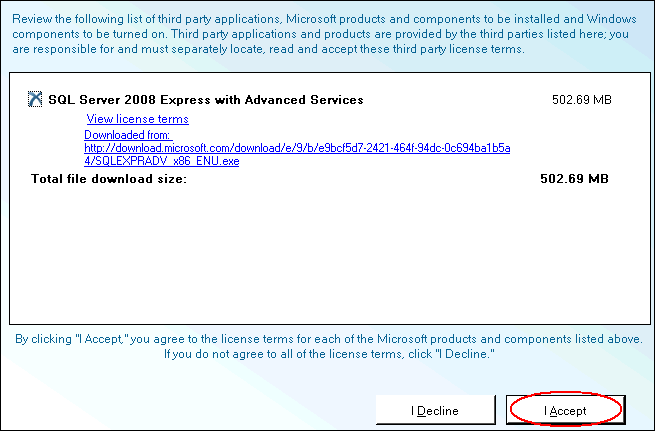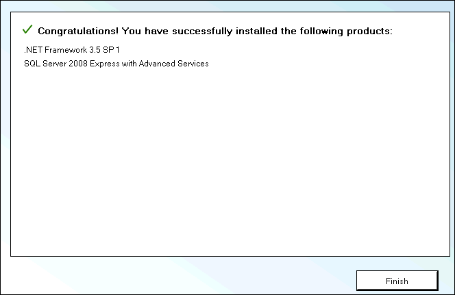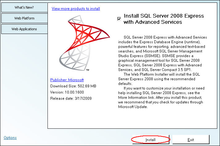 This section describes the steps necessary to install the SQL Server 2008 Express Edition via the Microsoft Web PI (Platform Installer). The installation process for SQL Server 2005 Express has different setup screens, however, all the necessary settings for SQL Server are covered in this example.