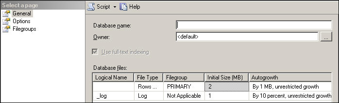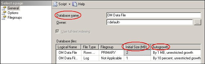 Enter a name for the new database on the General page. Also set the Initial Size and Autogrowth values for the database: