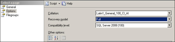 Select the Options page and set the Collation and Recovery Model parameters for the database: