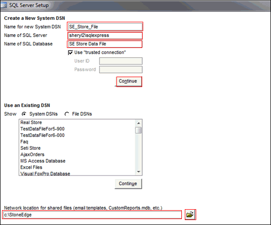 To create the ODBC Connection, enter the name for a new ODBC data source (DSN). The name cannot contain any spaces or punctuation, other than underscores ( _ ). In this example, the new ODBC connection will be named SE_Store_File. Next, enter the name of the SQL Server instance (sheryl2\sqlexpress in this example). Finally, enter the name of the new database created in the previous section of this article (SE Store Data File).