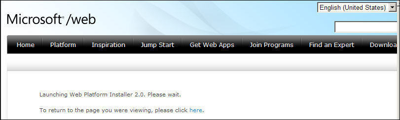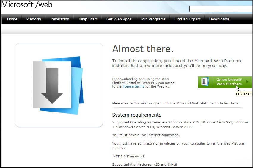 When the Microsoft Web Platform Installer window opens, click Get the Microsoft Web Platform to install the application. (A Windows Administrator ID must be logged on to perform this function.)