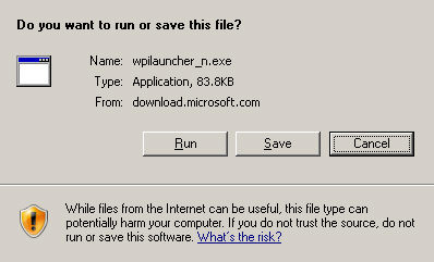 Choose Run or Save option when prompted to begin downloading the Web Platform Installer (wpilauncher_n.exe).