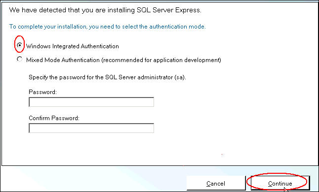 You are prompted for SQL settings during the installation process. Choose which authentication mode to use and click Continue.