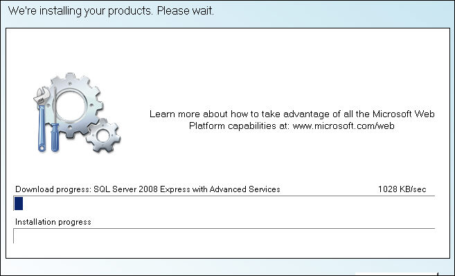 When the Microsoft Web Platform Installer application has been installed successfully, the following screen will appear to begin the installation of SQL Server Express 2008 with Advanced Services and the necessary pre-requisites.