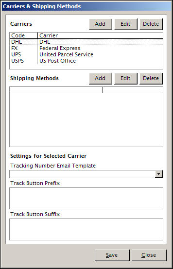 It is where additional shipping carriers, other than those major carriers that are pre-defined in the program, can be added to the system. The names that carriers assign to their shipping methods can also be entered here. Click on one of the shipping carriers in the list to see their shipping method names in the Shipping Methods section of the screen.