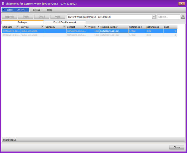 The View or Void FedEx Shipments function is one way to void a shipping label and its associated tracking number. Other activities that can be performed at this screen are printing a ground manifest, or package pickup receipt, as well as reprinting any shipping documents containing a tracking number.