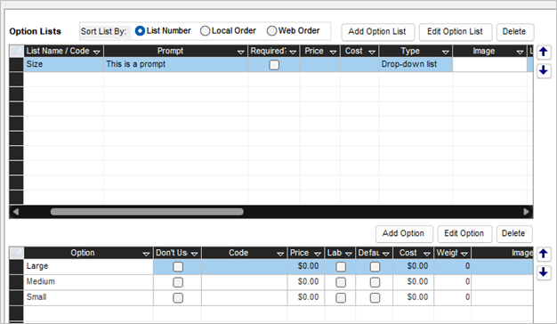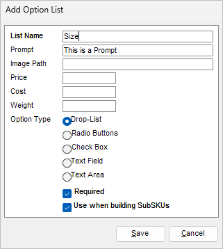 NOTE: It is not advised to edit an option list’s “Option Type” if options already exist. You will be prompted to delete the options if choosing to change the “Option Type” to an incompatible type.