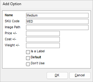 - Weight -> Defines weight of item when option is selected. This value is +/- to the item’s original value.