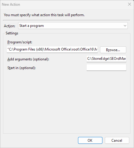 - Add Arguments -> C:\StoneEdge\SEOrdMan.mdb /nostartup /x autoimport
