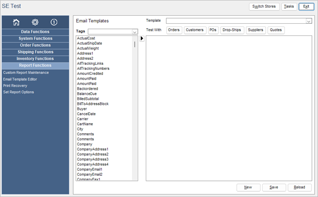 - Main Menu -> Settings (Gear Icon) -> Report Functions -> Email Template Editor.