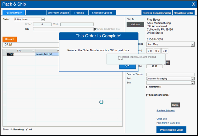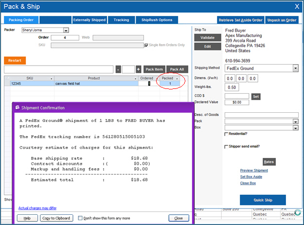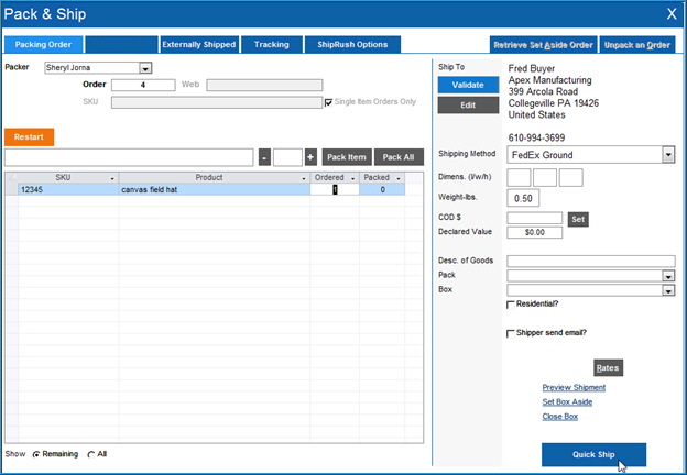 If you do not care to confirm the correct items are packed, you can speed the process by using QuickShip to jump right to printing the shipping label and you are done. The program automatically assumes the correct items are packed and stores that information in the database.