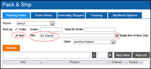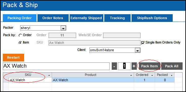 Double-click in the SKU column. If more the quantity is greater than one, use the + and - buttons to change the value, and select Pack Item. Repeat for all items in the order.