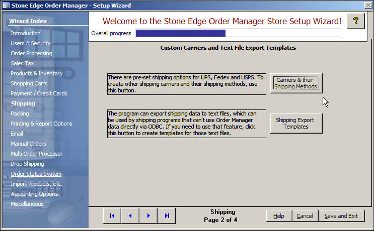 The Add/Edit Shipper/Shipping Method screens (Figures 3-6) can be accessed from the Carriers & Shipping Methods screen (Figure 2); which is opened by the button labeled Carriers & their Shipping Methods on the second page of the Shipping section of the Store Setup Wizard (Figure 1).