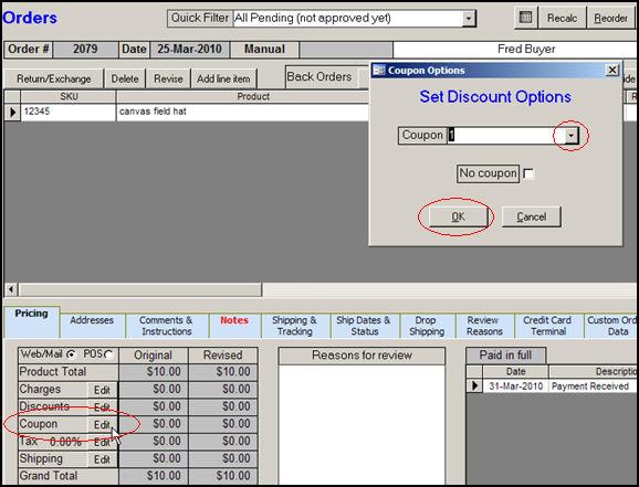 Figure 2: Pricing summary of the Orders screen - adding a coupon to an order