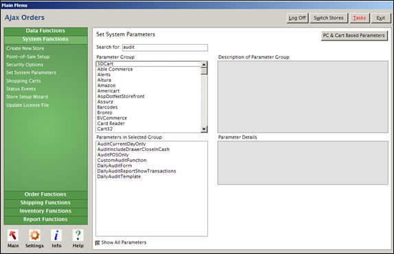 AuditPOSOnly - If TRUE, only transactions from orders entered at the POS form or at the Manual Orders form with the POS option selected will be included in the Daily Audit. If FALSE, transactions from all orders, including Internet orders, will be included in Daily Audits. This parameter can also be set at the POS Setup: Miscellaneous tab.
