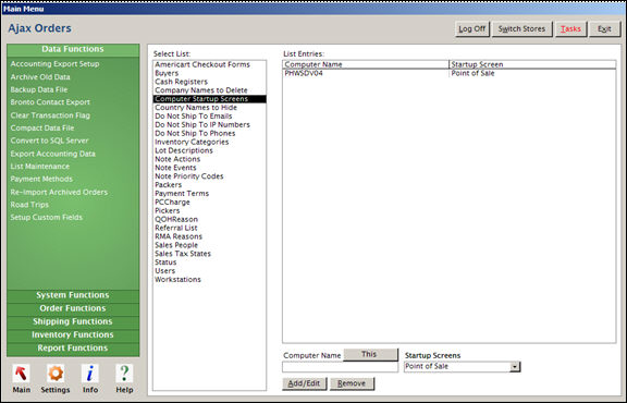 Select the appropriate startup screen name for that computer from the Startup Screens drop-down list. If any screen other than the Main Menu or Custom Menu is selected, that will be the only screen that will be available to all users on that workstation. When the startup screen is closed, the program will close as well. The use of Custom Menus is rare.
