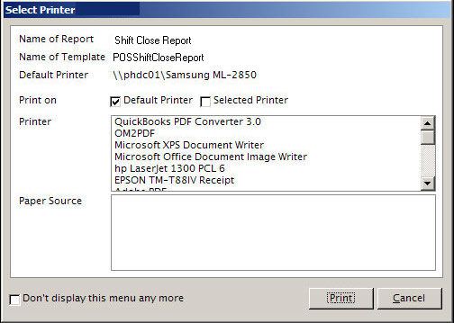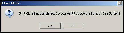If Yes is selected the program will close the POS screen, or the entire program, if the workstation is only permitted to open the POS system of OMS . Refer to Computer Startup Screens in the List Maintenance function of the program. See the Knowledge Base article, Defining Task Specific Workstations, for instructions. The next time the program or POS screen is opened, the user will be prompted to start a new shift, as shown in the No response below.