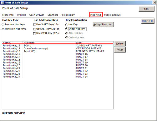 In the following example, the Reset button on the Hot Keys tab of the Point of Sale Setup screen was used to load the default settings for Function keys 13-24.