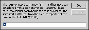 If No is selected, the user will be prompted to establish a new shift and verify the starting amount of cash in the drawer before the POS interface is re-opened: