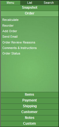 Select the List Tab to produce a list of orders matching the current Quick Filter, or choose the Search Tab to look for orders based on criteria entered by the user. Select the Menu Tab to return to the default view of the Accordion.